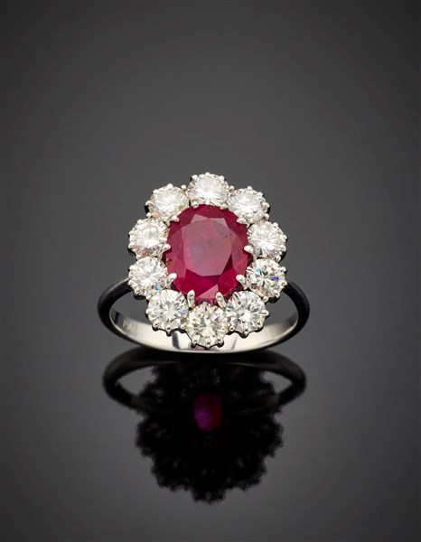 Anello in oro bianco con rubino ovale di ct. 2,95 e diamanti rotondi per complessivi ct. 1,80 circa, g 4,36 circa misura 14/54.