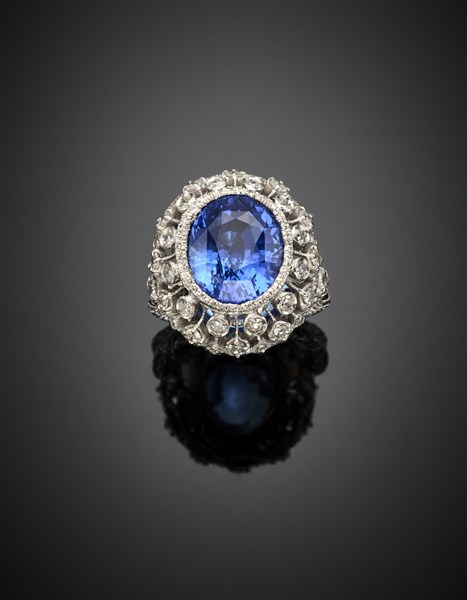 Anello in platino con diamanti a contornare uno zaffiro ovale di ct. 8,20 circa, g 10,69 circa misura 13/53.