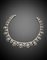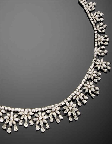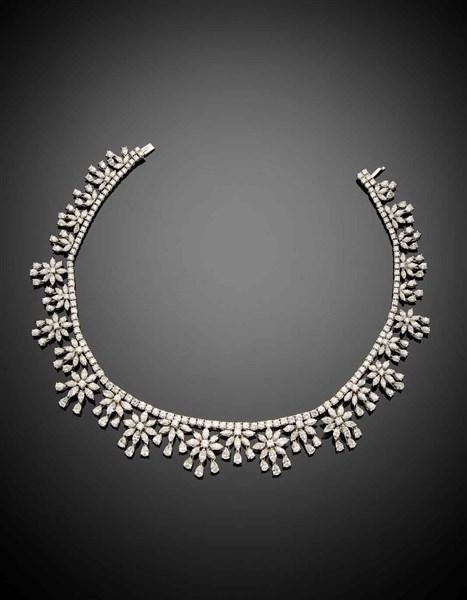 Collier in oro bianco e diamanti rotondi rifinito con elementi floreali a scalare in diamanti navette, a goccia e rotondi per complessivi ct. 35 circa, g 66,61 circa, lungh. cm 36,40 circa. Logato e marcato HS, 136 BO.