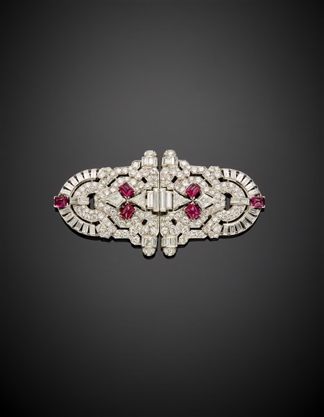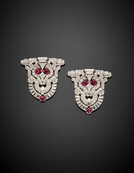 Doppia spilla a clip in platino e oro bianco con diamanti rotondi, baguette e fantasia rifinita con rubini cabochon, g 25,94 circa, lungh. cm 7,10 circa.
