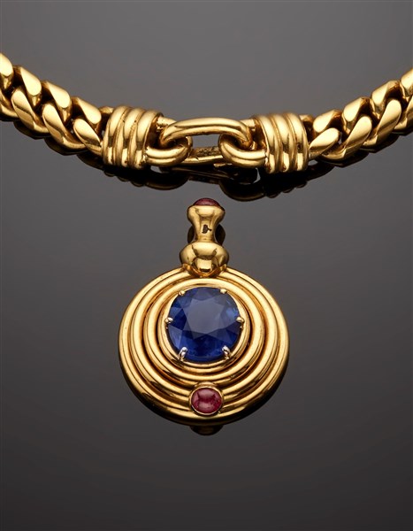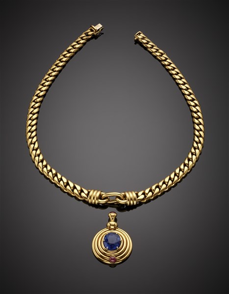 Collier a catena con pendente rimovibile in oro giallo, al centro uno zaffiro ovale di ct. 11 circa rifinito con due piccoli rubini ovali cabochon, complessivi g 137,46 circa, lungh. cm 40 circa. Collier marcato 186 TO.