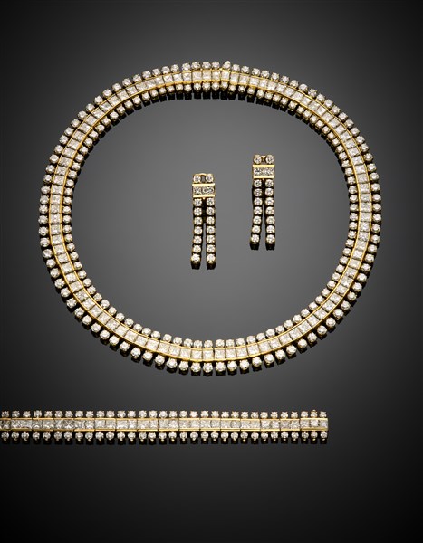 Demi-parure in oro giallo diamanti rotondi e radiant per complessivi ct. 94 circa composta da collier di cm 42 circa, bracciale di cm 17,9 ed orecchini pendenti di cm 3,7 circa, complessivi g 152,29 circa. Reca firma Chantecler.