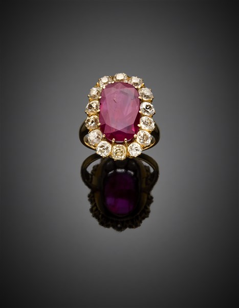 Anello in oro giallo con rubino a cuscino di ct. 6 circa e diamanti old mine per complessivi ct. 2,80 circa, g 6,40 circa misura 12/42.