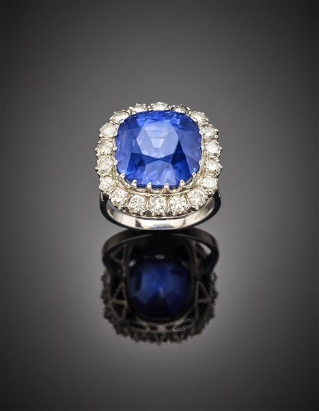 Cushion ct. 22 circa sapphire and diamond white gold cluster ring, diamonds in all ct. 1.80 circa g 12.05 circa size 18/58.