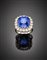 Anello in oro bianco con diamanti rotondi a contornare uno zaffiro a cuscino di