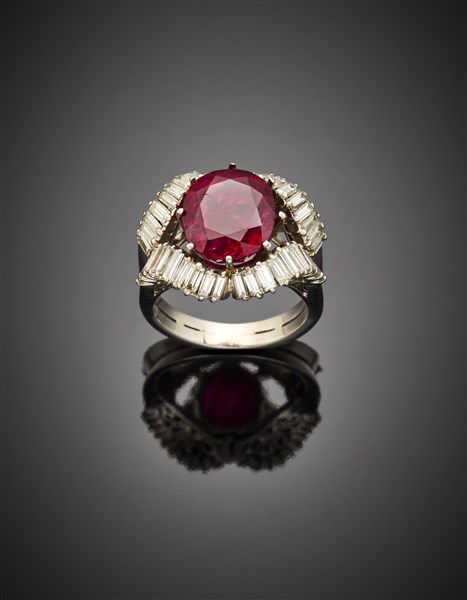 Anello in platino rifinito con diamanti baguette per complessivi ct. 1 circa e al centro un rubino a cuscino di ct. 5,49, g 8,65 circa misura 7/47. Marcato 307 AL.