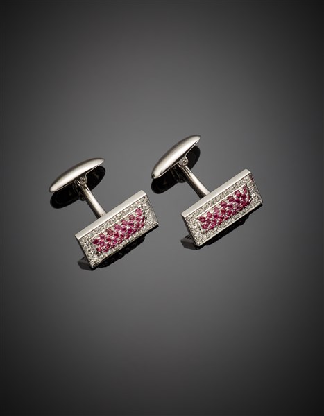 Diamond and ruby white gold rectangular cufflinks, g 16.17 circa, length cm 1.90 circa. Signed Angelo Spinelli, 2885 AL.