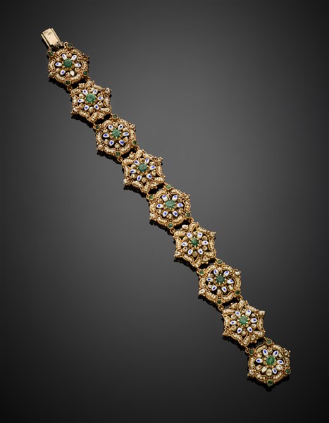 Yellow 12K gold modular bracelet with seedpearl, emeralds and enamel, g 39.55 circa, length cm 19 circa.