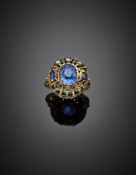 Anello in oro giallo e argento rifinito con diamanti irregolari a mezza rosetta e tre zaffiri ovali, il centrale di ct. 3,20 circa, g 6,27 circa misura 9/49. (lievi difetti)