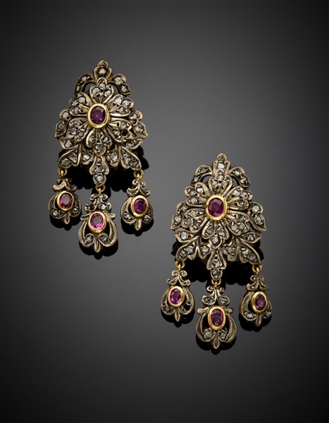 Orecchini pendenti in oro giallo e argento con diamanti a mezza rosetta e rubini, g 20,39 circa, lungh. cm 4,40 circa. Marcati 04 FI.