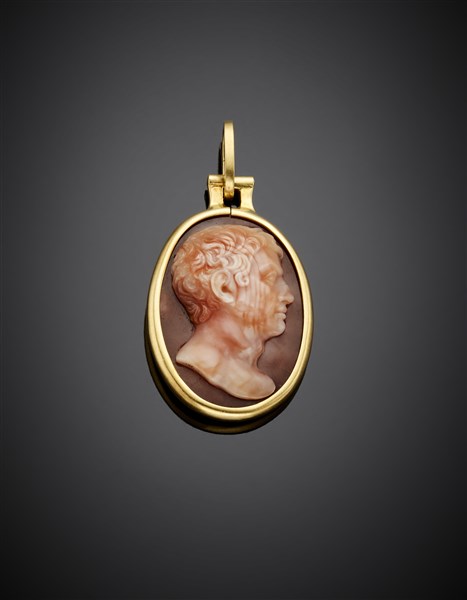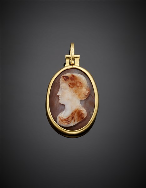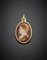 Pendente in oro giallo e due cammei in agata con profili scolpiti, g 8,29 circa