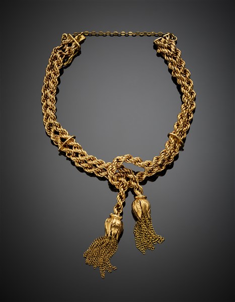 Yellow gold interwoven bracelet with tassels, g 23.33 circa, length cm 19 circa. Signed Industria Argentina. (slight defects)