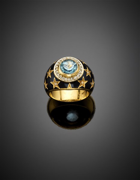 Anello in oro giallo con smalto nero e piccoli diamanti, al centro un topazio azzurro, g 15,18 circa misura 15/55. (difetti)