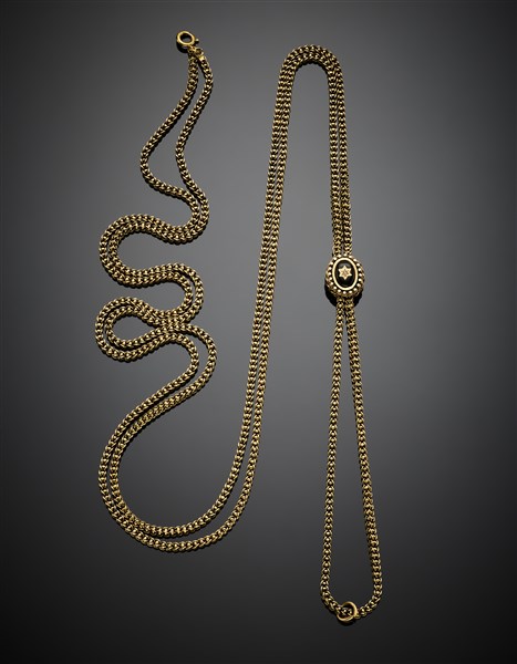 Doppia catena a fune intrecciata in oro 333/1000 con passante rifinito con smalti neri e una mezza perla, chiusura in oro 750/1000, g 55,57 circa, lungh. cm 79 circa. (difetti)