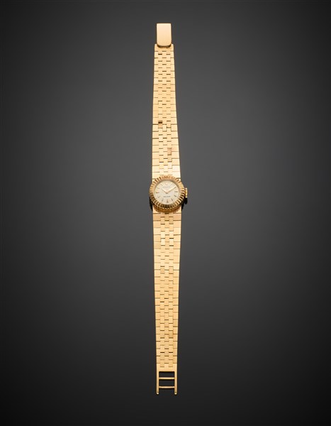 Orologio da polso da donna in oro giallo con bracciale modulare, g 36,07 circa, lungh. cm 17 circa. (lievi difetti)
