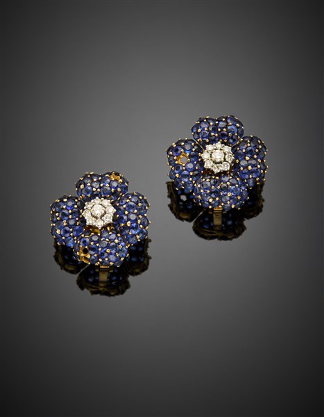 Orecchini a lobo a guisa di fiori in oro giallo con diamanti e zaffiri, g 25,09 circa, diam. cm 2,50 circa. (difetti e mancanze)
