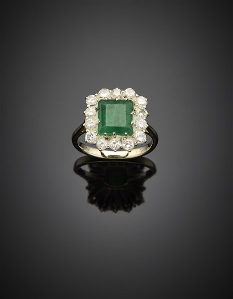 Octagonal ct. 1.95 circa emerald And round diamond white gold cluster ring, diamonds in all ct. 0.80 circa, g 4.64 circa size 15/55.