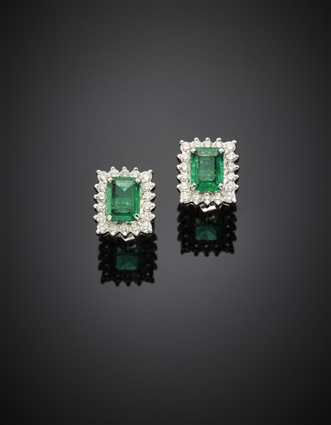 Orecchini a lobo in oro bianco rifiniti con diamanti per complessivi ct. 0,50 circa e smeraldi ottagonali per complessivi ct. 2,20 circa, g 5,60 circa, lungh. cm 1,20 circa.