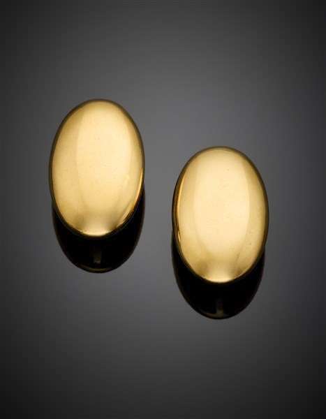 Yellow gold oval earclips, g 26.94 circa, length cm 3.20 circa. Signed Cusi. With felt pouch (slight defects)