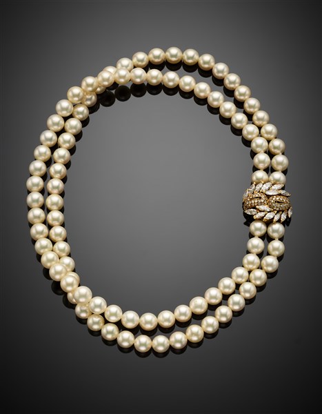 Collana a due fili di perle coltivate di mm 9/9,5 circa, chiusura in oro giallo rifinita in diamanti marquise e rotondi per complessivi ct. 3,20 circa, g 112,43 circa, lungh. cm 41 circa. Marcata 1100 MI.