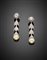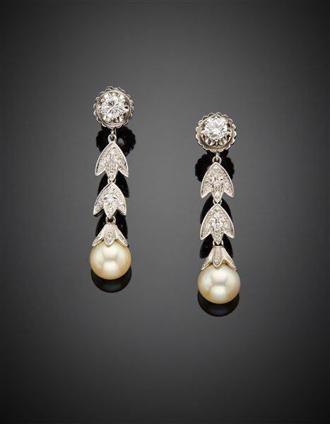 Orecchini pendenti in oro bianco, diamanti per complessivi ct. 1,10 circa e perle di mm 9.10 circa, g 10,07 circa, lungh. cm 4,50 circa.