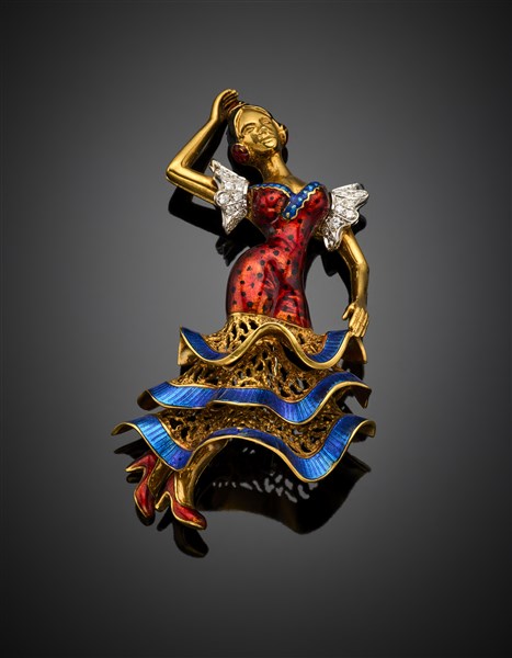 Spilla/pendente a guisa di ballerina in oro giallo e bianco con diamanti e smalti, g 53,49 circa, lungh. cm 9,30 circa. Firmata e marcata Damiani, 1481 AL. (lievi difetti)