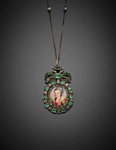 Pendente a fiocco con miniatura in argento, smeraldi e diamanti a mezza rosetta, il ritratto di dama in smalti rifinito con contorno di piccole gemme varie e paste vitree, a tenerlo una catenina lungh. cm 41 circa in oro bianco con diamanti a mezza rosetta, g 11,48 circa, lungh. cm 5,50 circa. La catenina marcata 1 AR. In scatola originale