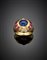 Anello in oro giallo con zaffiro cabochon centrale di ct. 3,20 circa, rifinito con diamanti e rubini calibré, g 16,80 circa misura 15/55.