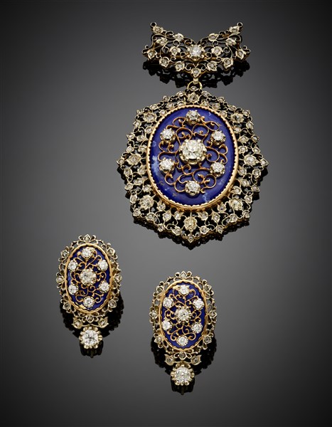 Old mine diamond and enamel bi-coloured gold jewellery set comprising a cm 7,3 circa brooch with detachable pendant and cm 3 circa earclips, diamonds in all ct. 2.50 circa, in all g 36.43 circa. (defects)