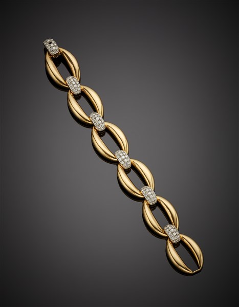 Bracciale in oro giallo, bianco e diamanti per complessivi ct. 2,70 circa, g 77,33 circa, lungh. cm 18,10 circa. (mancanze)