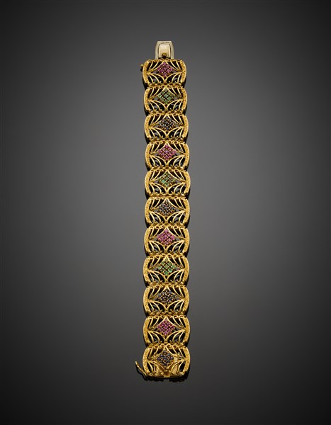 Yellow gold openwork modular bracelet accented with rubies, emeralds and sapphires, white gold detail, g 47.86 circa, length cm 17.50 circa.