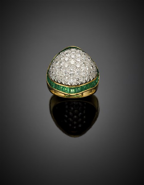 Anello in oro giallo con pavè di diamanti rotondi per complessivi ct. 3 circa e smeraldi carrè, g 13,30 circa misura 17/57. Punzonato 1413 MI.