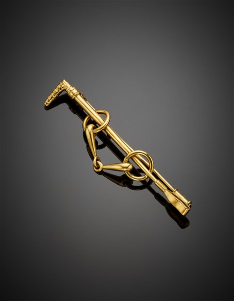 Yellow gold tie pin accented with the iconic pieces of the Maison, g 9.74 circa, length cm 6.40 circa. Signed Hermes-Paris n° 44328 and french hallmarks.
