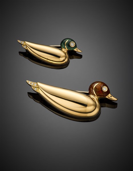 Lotto composto da due spille a guisa di paperelle in oro giallo rifiniti con smalti guilloché e diamanti, complessivi g 15,7 circa, lungh. cm 4,50 e 3,30 circa. Punzonato 2155 AL.