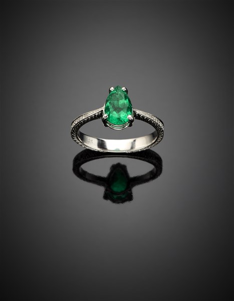 Anello in oro bianco, diamanti per complessivi ct. 0,40 circa rotondi e smeraldo a goccia di ct. 1,39, g 3,62 circa misura 15/55.