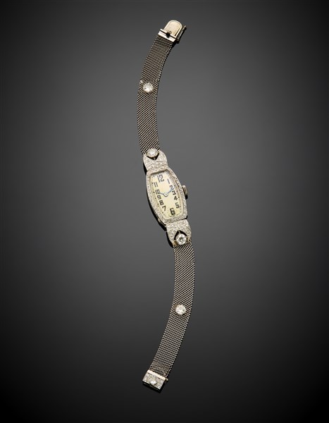 Orologio da polso da donna in platino, oro bianco e diamanti per complessivi ct. 1,30 circa, con bracciale, movimento firmato Paul Ditisheim, n° 100924, cassa n° 2218, g 23,04 circa, lungh. cm 16,50 circa. (lievi difetti)