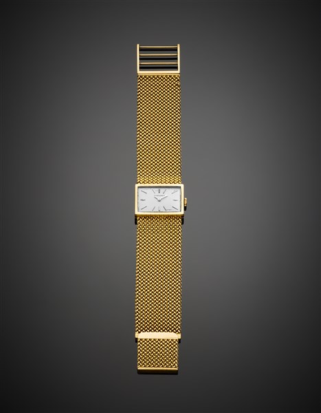 Yellow gold lady's wristwatch with bracelet, g 68.20 circa, length cm 18 circa. Dial, case, crown and movement signed Longines, bracelet signed FROV.