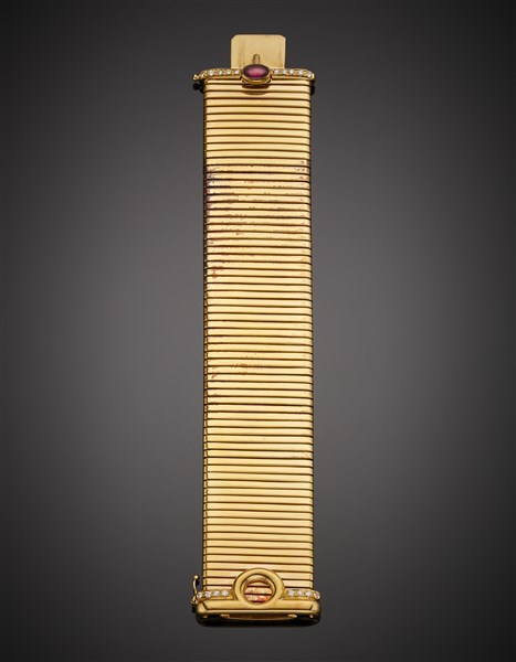Bracciale in oro giallo a maglia tipo tubogas, diamanti e rubino ovale cabochon
