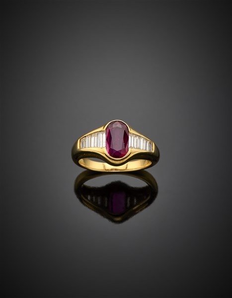 Anello in oro giallo con rubino a cuscino di ct. 1,10 circa rifinito con diamanti a baguette a scalare per complessivi ct. 0,70 circa, g 6,67 circa misura 14/54.