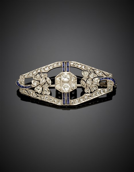 Broche a losanga in platino e diamanti old mine e a mezza rosetta rifinita con zaffiri buff top, g 8,34 circa, lungh. cm 4,40 circa.