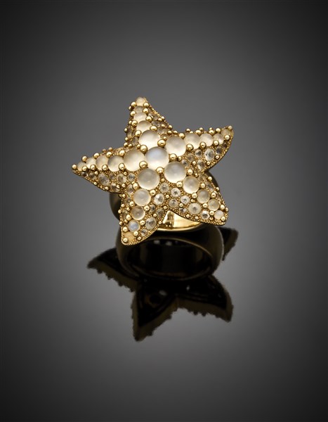 Cabochon moonstone and topaz yellow gold "Sirene" starfish ring, g 37.22 circa size 13/53. Signed and marked Pomellato, 469 MI.