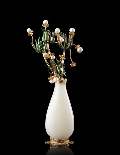 Composizione floreale con vaso in giada, base e fiori in oro giallo rifinito con smalti verdi, quarzi e perle, lordi g 97,13 circa, h cm 13,50 circa. Attribuito a Romolo Grassi