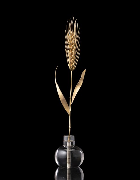 Composizione floreale con vaso in quarzo ialino e una spiga di grano in oro gia