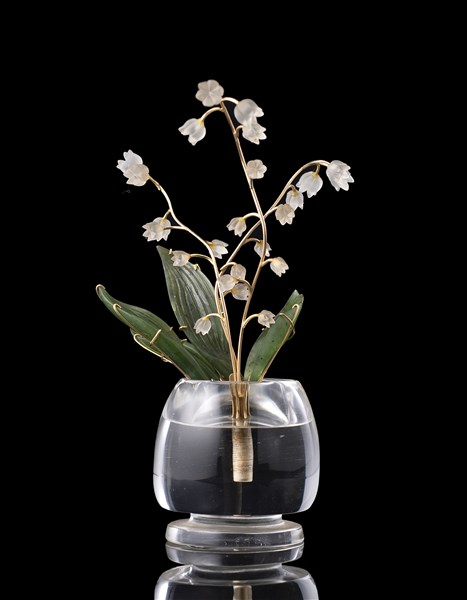 Hyaline quartz vase with yellow gold carved nephrite and quartz lily of the valley posy, g 247.23 circa, h cm 13.50 circa. (defects and losses)