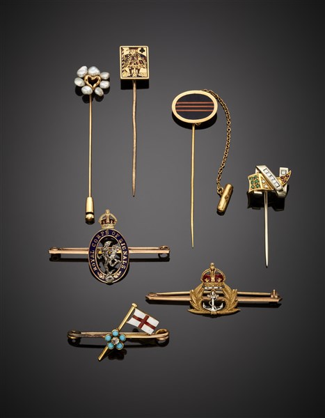 Lotto in oro giallo e bianco 333/1000 e 750/1000 composto da quattro spilloni e tre spille da uomo rifiniti con smalti e pietre varie, complessivi g 28,96 circa. (lievi difetti)