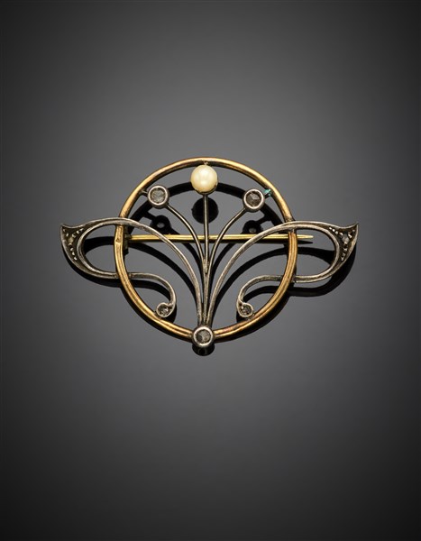 Spilla in oro giallo e argento con paste vitree e mezza perla, g 7,20 circa, lungh. cm 5,60 circa. (difetti)