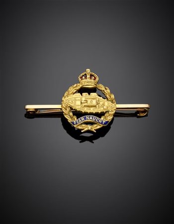 Spilla in oro giallo 333/1000 e smalti del Royal Tank Regiment, g 7,75 circa, lungh. cm 4,80 circa. Marcata C.P. Co.