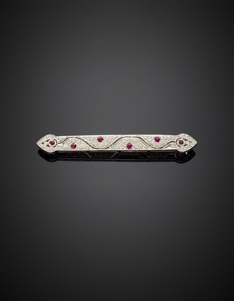 Lot 1221 | Spilla a barretta in oro bianco con diamanti e rubini, g 4,36 circa, lungh. cm