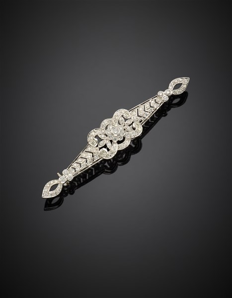 Lot 1223 | Spilla traforata a barretta in oro bianco e diamanti, g 4,36 circa, lungh. cm 6