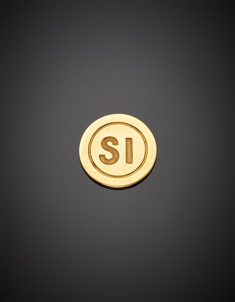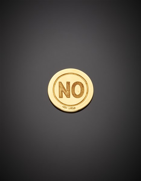 Medaglia “SI-NO” in oro giallo, g 11,23 circa, diam. cm 2,50 circa. Firmata Capello.